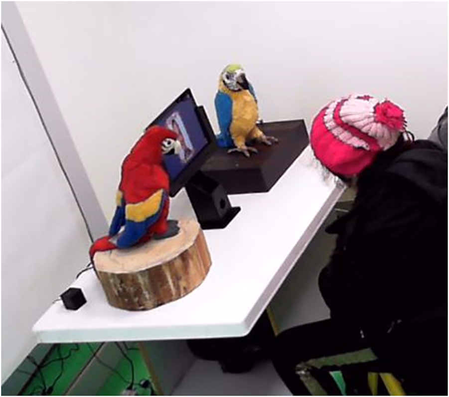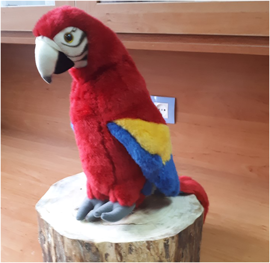Two parrot-like robots were used in this experiment (Figures 1, 2). The first robot that has been developed in our laboratory is RoboParrot (Figure 1), a robot based on a toy from Hasbro Company. Two motors facilitate the robot’s body, mouth, and eye movements. The other robot (Figure 2) is called Red, a fluffy toy with a servo motor embedded under its wooden stand to enable it to have a pan movement. Both robots are equipped with speakers to be used for voice-based interaction. The voices of two adult women were changed to make them funny and childlike. When RoboParrot speaks, its mouth opens and closes. When Red speaks its body turns left and right.