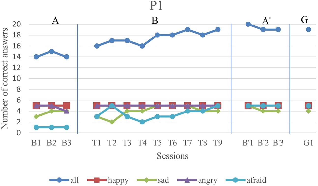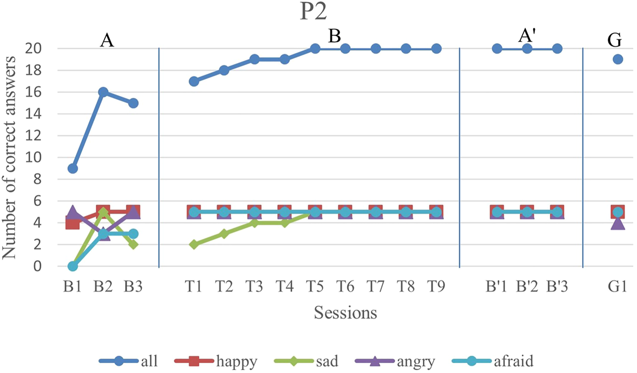 P1’s major problem was with fear facial expression and her first baseline has a low steady trend with only one correct answer in each session. In the first and second training sessions, she exhibited good improvement. Although she showed a decrease in the fourth session, her trend line is gradually increasing for the sessions after it.