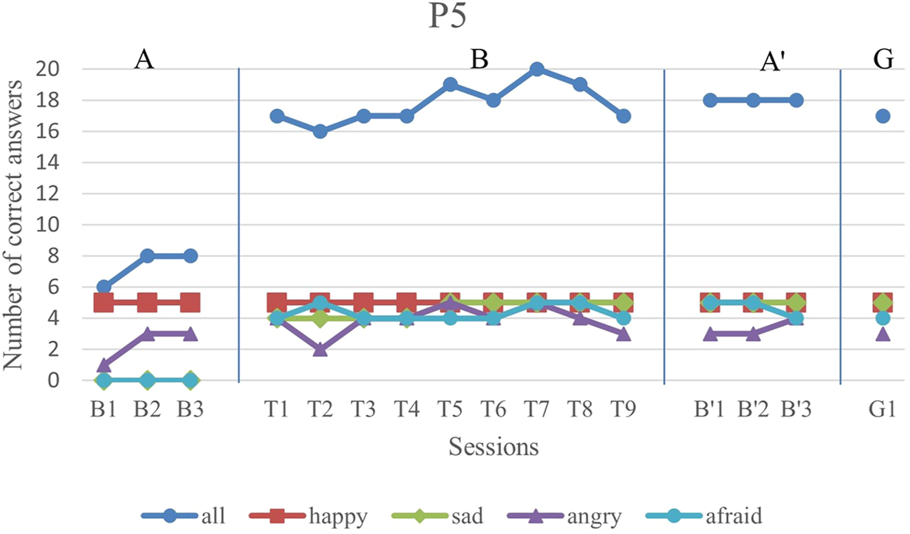 P5 could not recognize any of the sadness and fear emotion images in the first baseline phase. But, as the training sessions began, he showed a considerable improvement in these two emotions. His overall trend line in all emotions was gradually increasing.