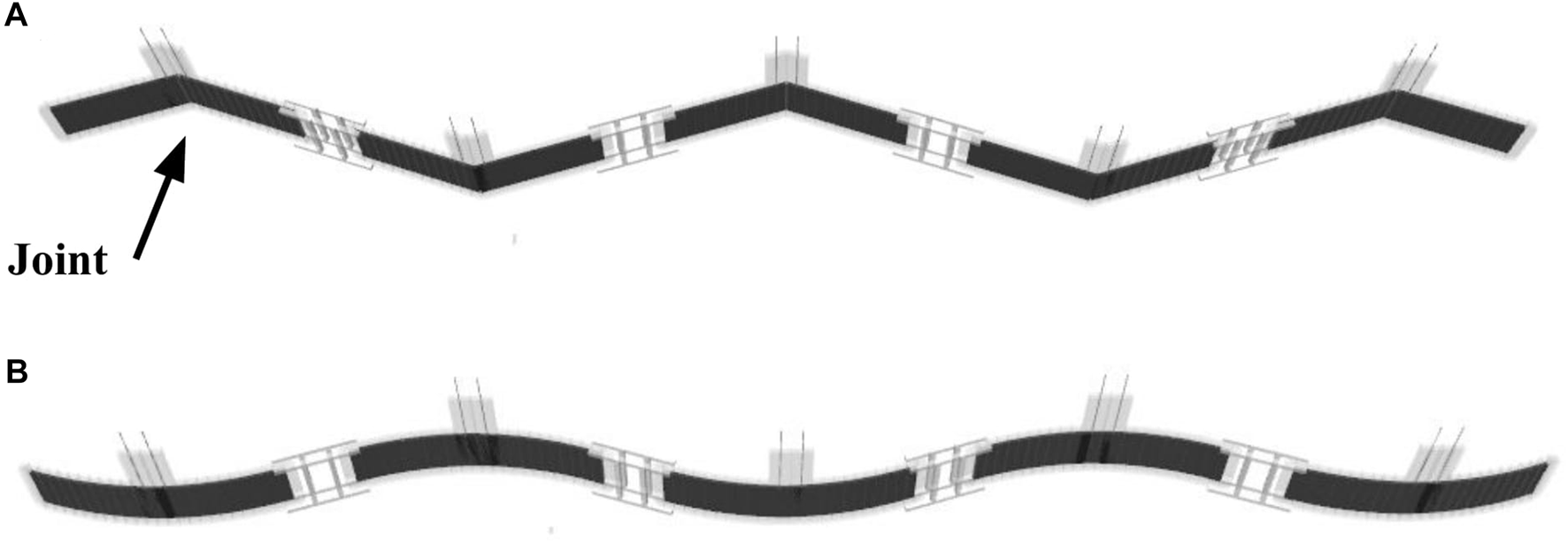 As such, in this study, we use MuJoCo to design the soft and rigid snake robots with the same size (length 27.0 cm, width 1.5 cm, and thickness 0.5 cm), mass (7.93 g), and output torque of actuators (12 Nm). The models of these robots are shown in Figure 2. The soft snake robot has five segments, every of which actively deforms independently with the simulated actuation behavior of a DEA. Each segment is split into a connected series of thin-sliced elements to realize the deformable attribution of the DEA, which are alternately connected by active joints and passive joints in the rotation. The active joints were controlled by the output torque of the simulated motor set on it, which was used to simulate the output characteristics of the DEA. All active joints in one segment are simultaneously controlled by the same input signal. The characteristics of the DEAs can be adjusted by tuning the attributes of passive joints.