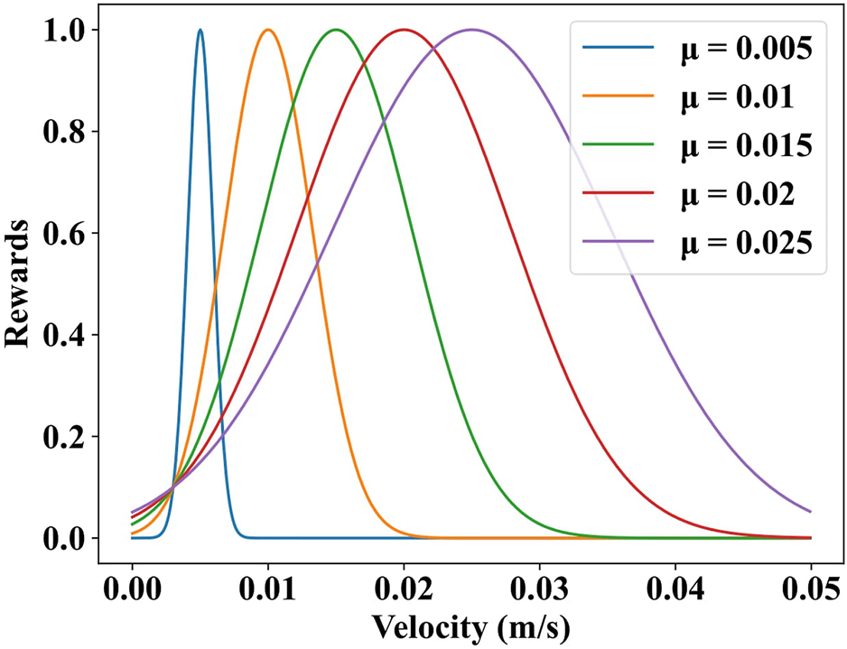 In thewe set the target velocity of the snake robots using a Gaussian distribution f (Velx; μ, σ), where Velx denotes the current velocity of the robot. μ denotes the target velocity of the robot, as shown in Figure 3. The other terms are the same as those in .