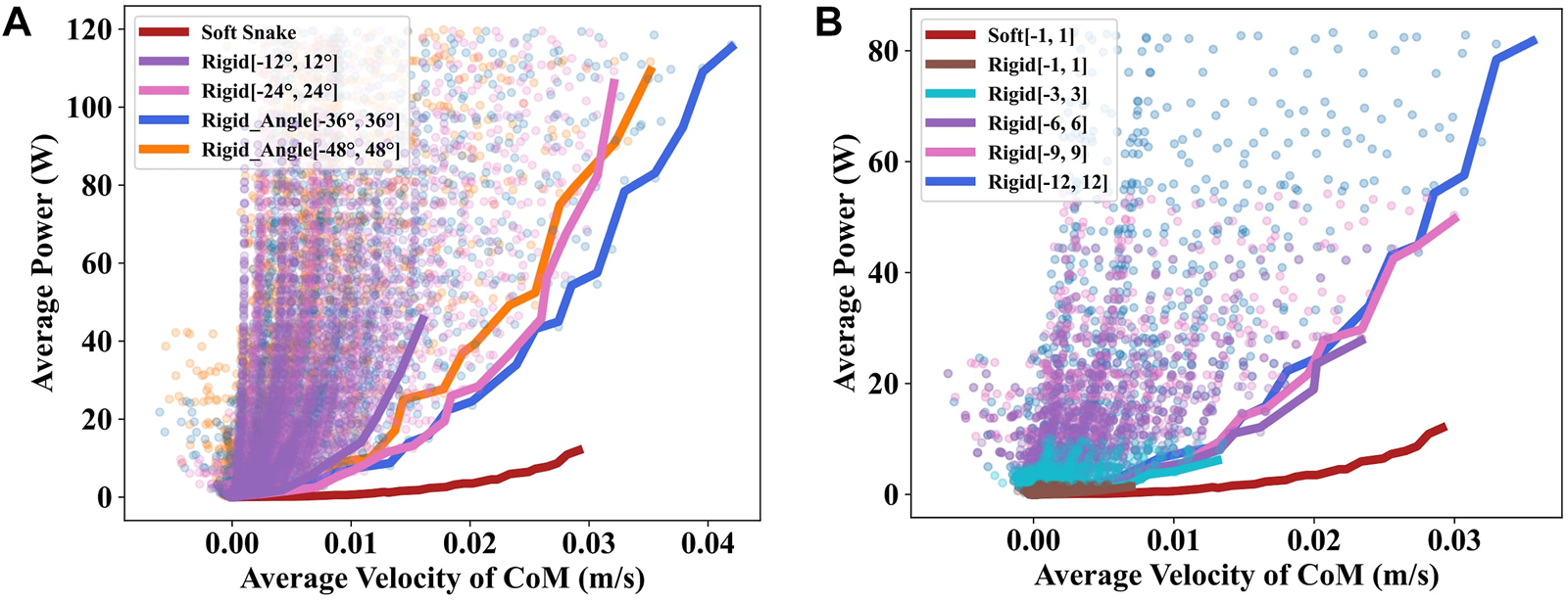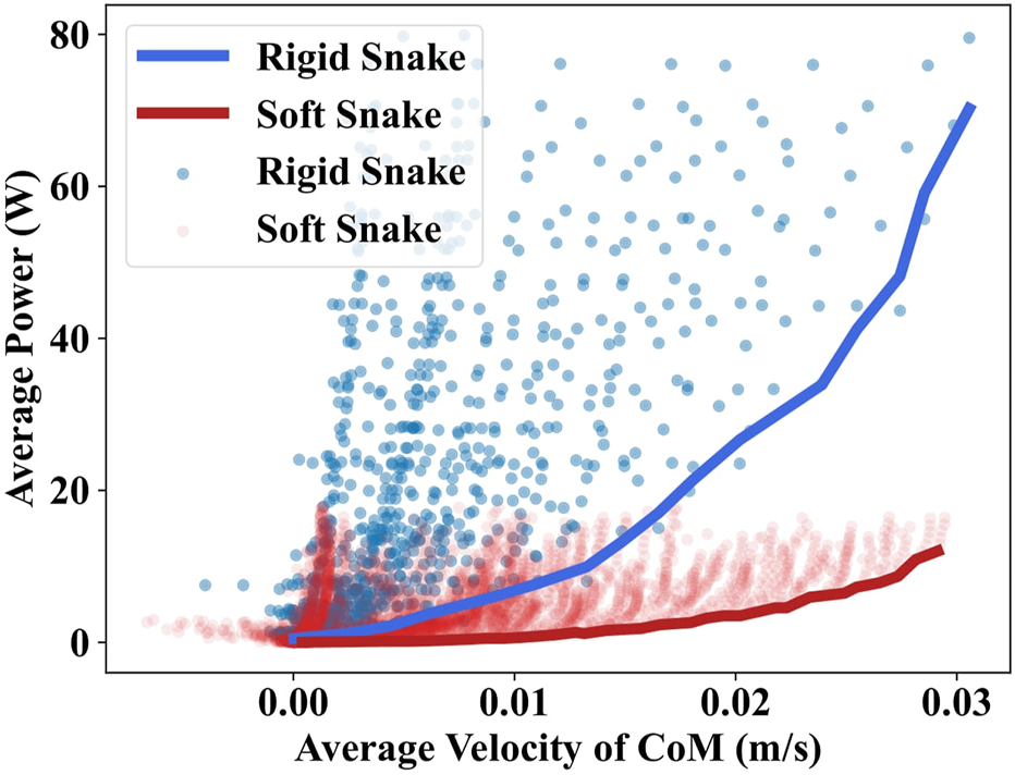 Utilizing the grid search, the gait equation controller generated 3,600 different gaits for the soft snake robot and rigid snake robot. In Figure 4, we present the results of the average velocity of the CoM and the average power of the two snake robots using scatter plots for a maximum speed of less than 0.03 m/s. The comparison of the lower contour lines of the two results shows that the soft snake robot requires significantly less energy than the rigid snake robot to reach the same velocity, and the gap in energy consumption is further magnified as the velocity increases.