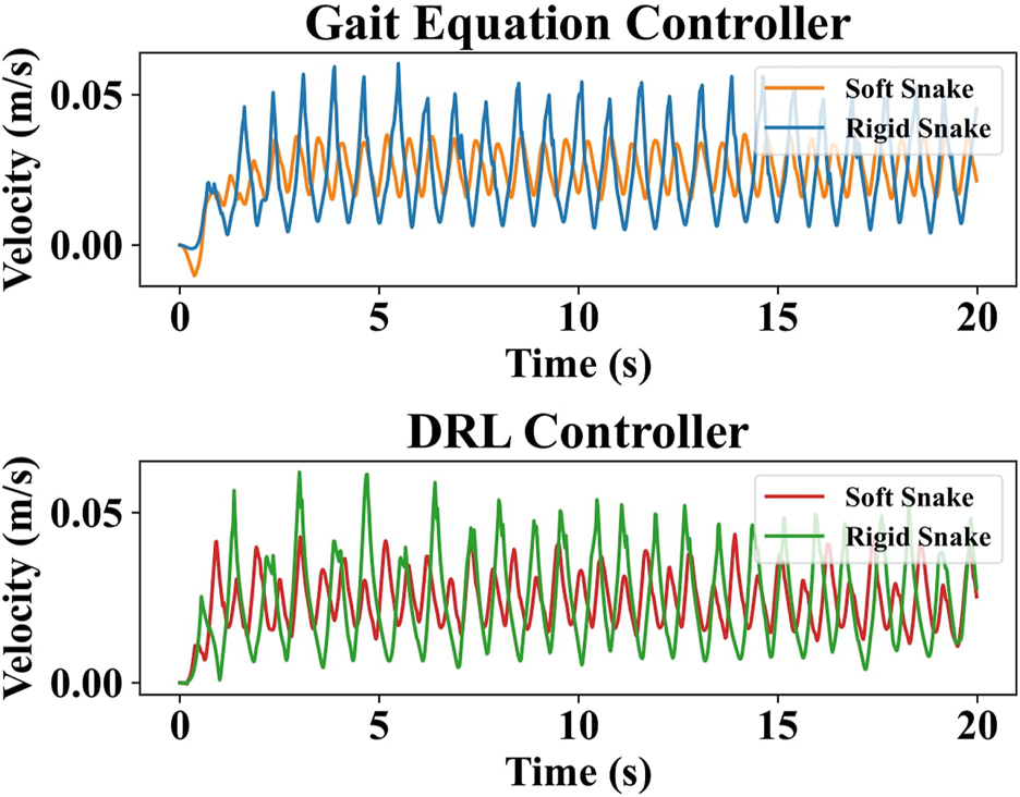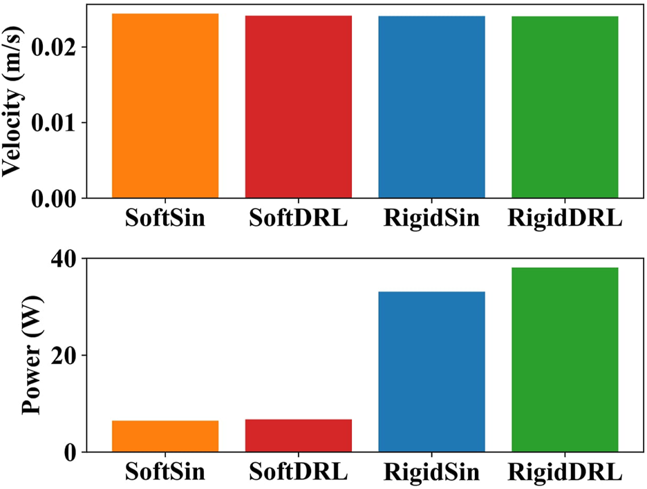 To analyze the reasons for this difference, four test results with similar average velocity and lowest output power were selected for the soft and rigid snake robots, respectively, for comparison. These results were individually generated using the DRL and gait equation controller, as shown in Figure 8. We calculated the results of the gait equation controller and found that when the snake robot had the same average velocity of 0.024 m/s, the output power of the soft-body snake robot was only 19.60% of that of the rigid-body snake robot.
