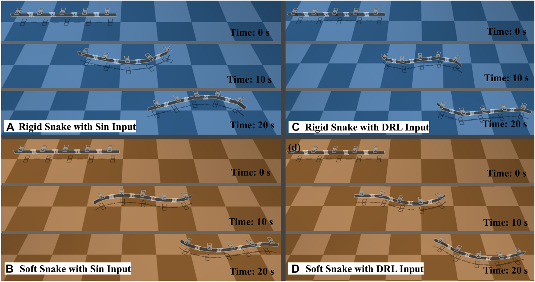 The test results for the four selected gaits, in order from left to right, are soft snake robot with gait equation controller, soft snake robot with DRL controller, rigid snake robot with gait equation controller and rigid snake robot with DRL controller.