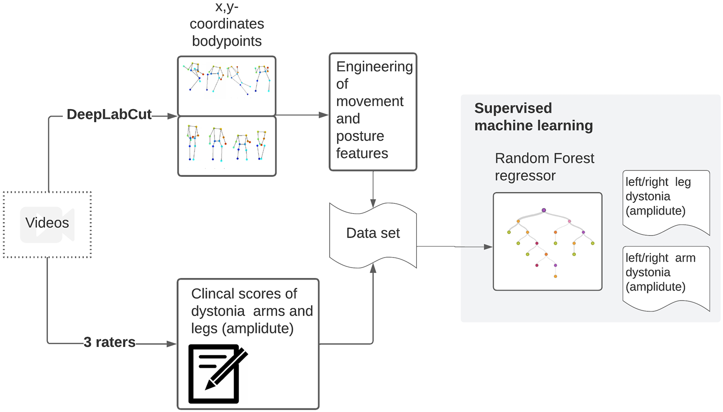 Methods: A total of 187 video sequences of 34 individuals with dyskinetic CP (8–23 years, all non-ambulatory) were filmed at rest during lying and supported sitting. Videos were scored by three raters according to the Dyskinesia Impairment Scale (DIS) for arm and leg dystonia (normalized scores ranging from 0–1). Coordinates in pixels of the left and right wrist, elbow, shoulder, hip, knee and ankle were extracted using DeepLabCut, an open source toolbox that builds on a pose estimation algorithm. Within a subset, tracking accuracy was assessed for a pretrained human model and for models trained with an increasing number of manually labeled frames. The mean absolute error (MAE) between DeepLabCut’s prediction of the position of body points and manual labels was calculated. Subsequently, movement and position features were calculated from extracted body point coordinates. These features were fed into a Random Forest Regressor to train a model to predict the clinical scores. The model performance trained with data from one rater evaluated by MAEs (model-rater) was compared to inter-rater accuracy.