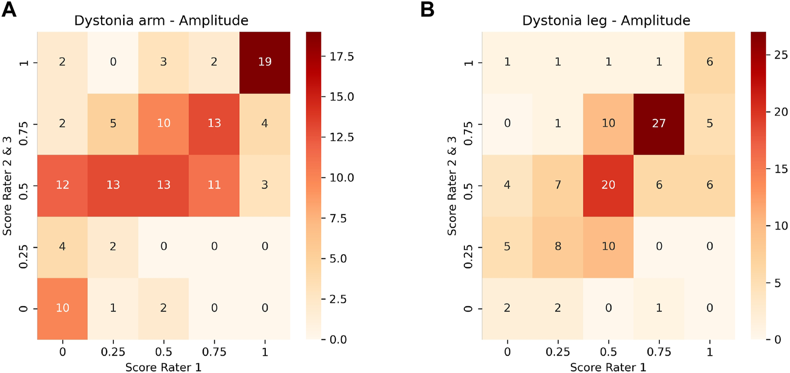 Comparison of scores between Rater 1 and Rater 2 and 3 for the amplitude of dystonia in arm (A) and leg (B).