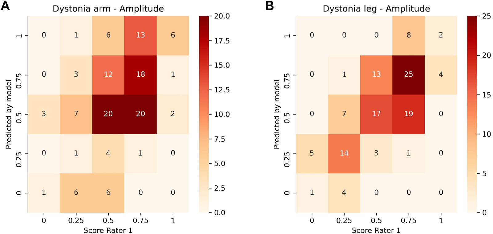 Heat plot of the correlation of the ground truth scoring for Rater 1 towards the predicted scores of the model for the amplitude of arm (A) and leg dystonia (B). The values on the diagonal represent a correct prediction.