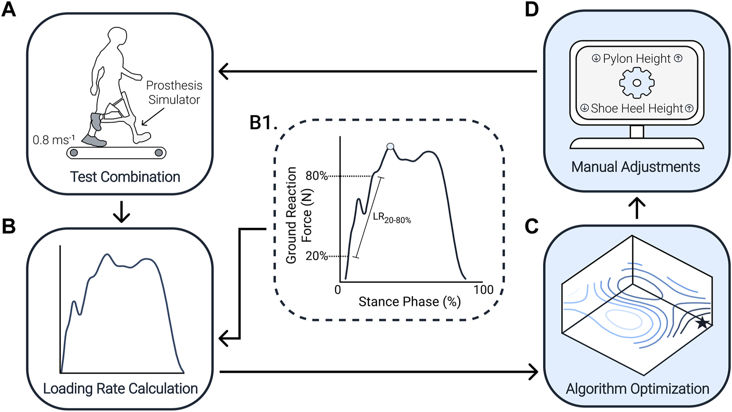 FIGURE 2. Human-in-the-loop optimization algorithm flowchart. (A) Participants walked on a treadmill at 0.8 ms−1 with the prosthesis simulator for each combination. (B) The treadmill recorded the ground reaction force. (B1) The loading rate was calculated from the ground reaction force by calculating the slope between 20%–80% from the first peak (blue circle). (C) We used gradient descent and successive parabolic optimization to find the optimal combination of shoe heel height and pylon height. (D) From this, the algorithm prescribes the following combination to test, that is, a specific shoe heel height and pylon height. This process continued until 16 combinations were completed. From those 16 combinations, we then determine the minimum amount that would have been required to converge on the optimum [(C), black star] after the experiment. Often the human-in-the-loop algorithm repeats certain conditions rather than testing each of the 16 possible combinations like the sweep protocol.
