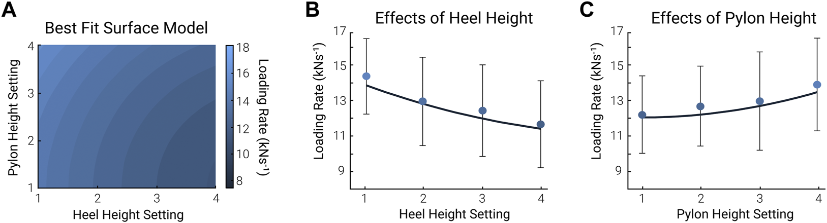 To find the optimal parameter combination from the sweep protocol, we fit a second-order polynomial that was a function of shoe heel height and pylon height against the loading rate. The minimum loading rate of this fitted surface determined the individual optimal combination. We reported the optimal parameter combination on a group level using the mean ± standard deviation.
