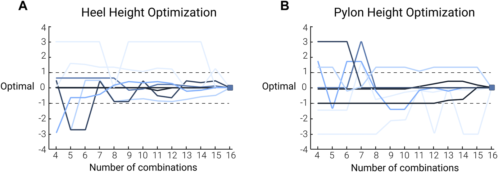 FIGURE 7. Human-in-the-loop optimization histories of participants: the pattern of shoe heel height (A) and pylon height (B) optimization during the HIL optimization for each participant. The colors of the lines relate to the convergence metric where the dark blue lines represent participants who converged in 4 combinations, and the light blue lines represent participants who did not converge to an optimal combination. The optimization history pattern is plotted relative to the final optimal parameter setting determined by the HIL optimization to visually see the convergence. As such, each line ends at 0 on the vertical axis. The dashed lines represent the band that was used to determine whether the algorithm achieved convergence or not. More specifically, we considered the algorithm to have converged if the prescribed parameter combination stayed within a band of ± 1 (n = 8).