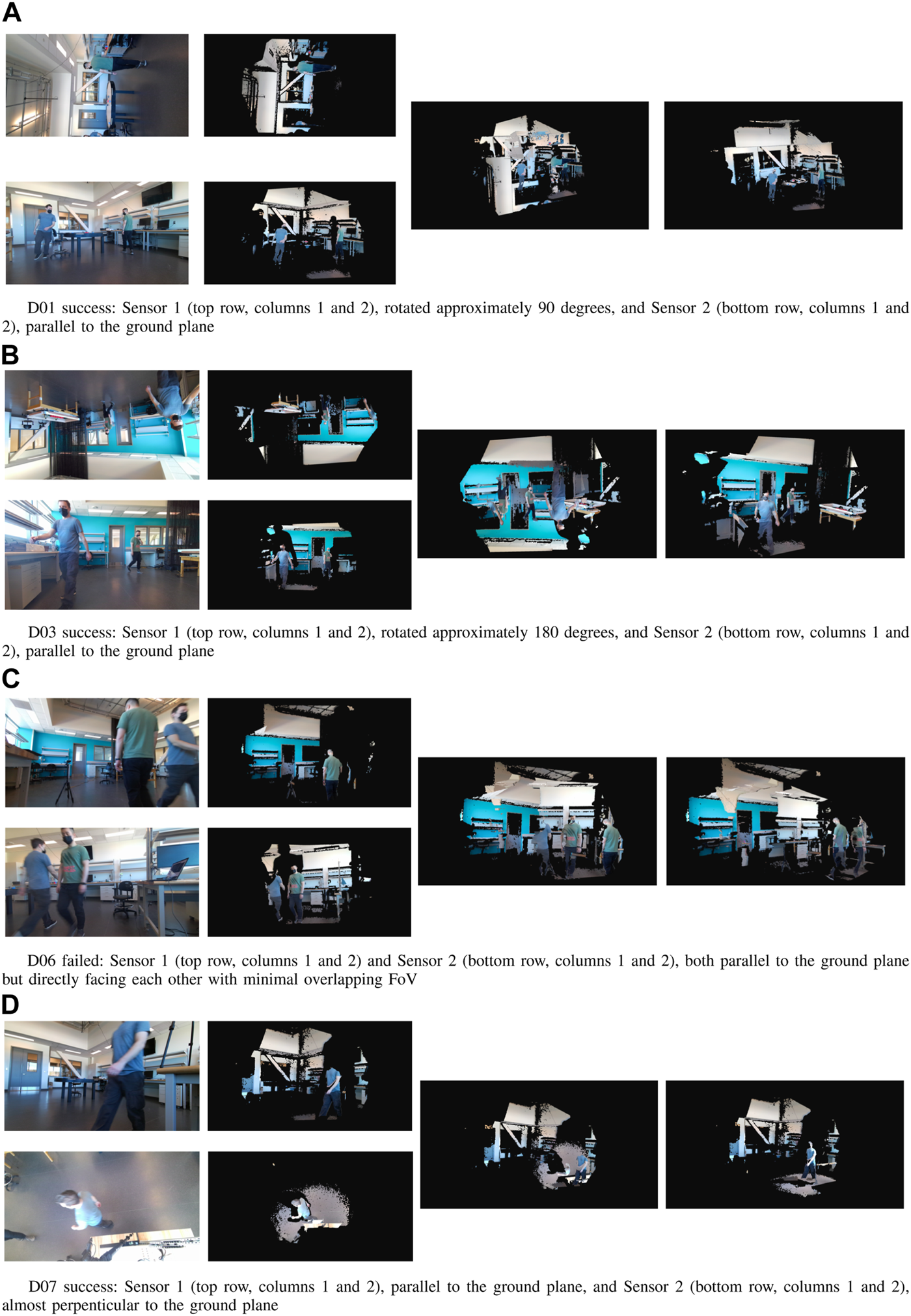 Examples of point cloud completion using our collected dataset. (A) D01 success: Sensor 1 (top row, columns 1 and 2), rotated approximately 90 degrees, and Sensor 2 (bottom row, columns 1 and 2), parallel to the ground plane, (B) D03 success: Sensor 1 (top row, col-umns 1 and 2), rotated approximately 180 degrees, and Sensor 2 (bottom row, columns 1 and 2), paral-lel to the ground plane, (C), D06 failed: Sensor 1 (top row, columns 1 and 2) and Sensor 2 (bottom row, columns 1 and 2), both parallel to the ground plane but directly facing each other with minimal overlap-ping FoV, (D), D07 success: Sensor 1 (top row, columns 1 and 2), parallel to the ground plane, and Sensor 2 (bottom row, columns 1 and 2), almost perpenticular to the ground plane.