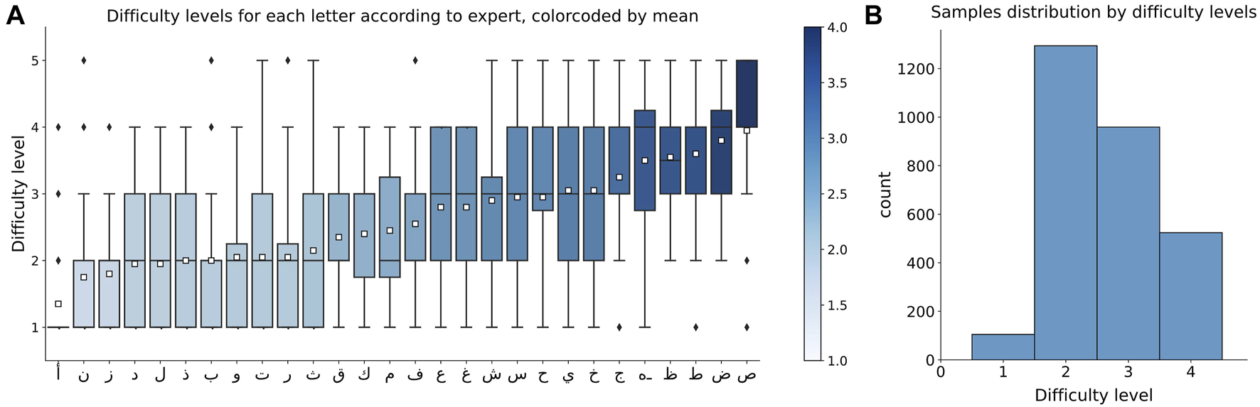 (A) Distribution of difficulty levels evaluated by experts for each letter, color coded by mean values for each letter, (B) Distribution of samples, which difficulty level is labeled by averaging and rounding the experts’ evaluations.