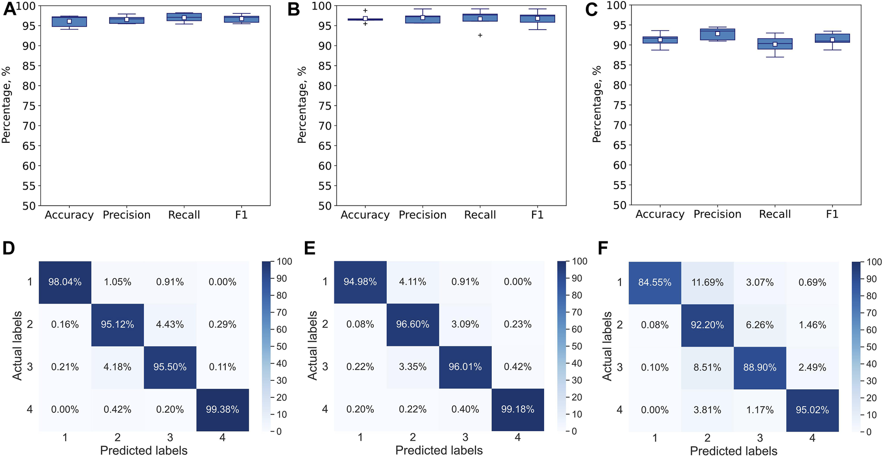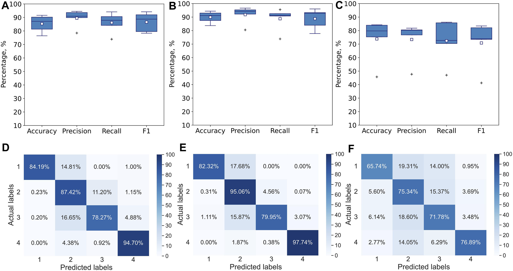 Performance of multiclass single-label 1D CNN model with convolution across time after 5000 epochs for leave-one-expert-out CV. The metrics are averaged over all 4 classes for each of the folds. Model has been trained and tested with (A) all 117 features, (B) Seven stylus kinematics features, (C) 110 hand kinematics features. Corresponding confusion matrices averaged over 5 folds: (D) for all 117 features, (E) for 7 stylus kinematics features, (F) for 110 hand kinematics features.