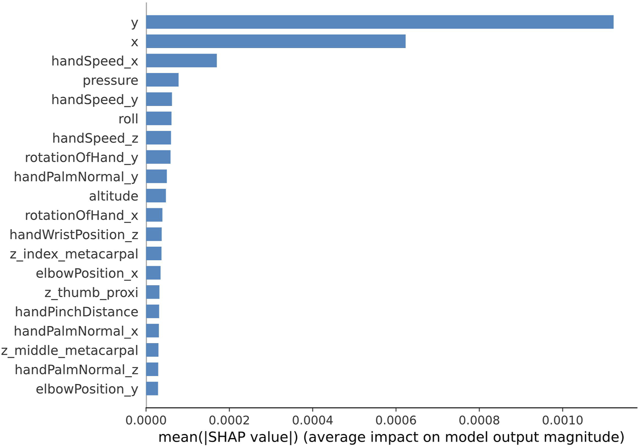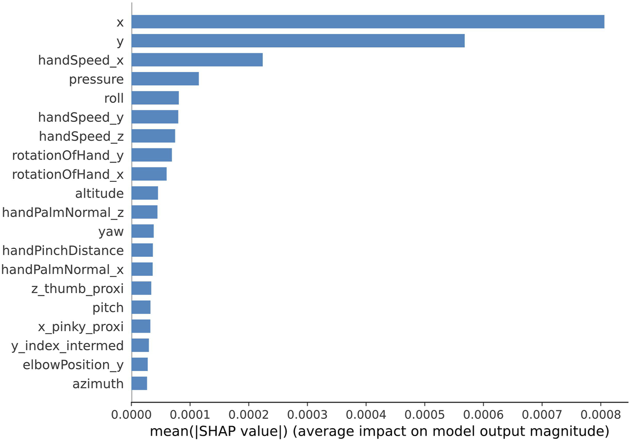 To determine which features are considered as significant for classifying handwriting tasks into four difficulty levels, Shapley values are calculated. The single-run accuracy of the trained model was 98%. Shapley values are calculated using randomly selected 100 instances from the training set as the background distribution and randomly selected 100 instances from the testing set for validation. For each of the 100 test instances, the calculated Shapley values are selected only for the classes that correspond to the true labels. The obtained Shapley values are averaged across 100 validation instances. The 20 most prominent features for the multiclass single-label classification are shown in Figure 6. These results demonstrate that positional coordinates of the stylus and pressure data as well as roll and hand speed from hand tracking device are significant features for evaluating the difficulty level of the handwriting task.