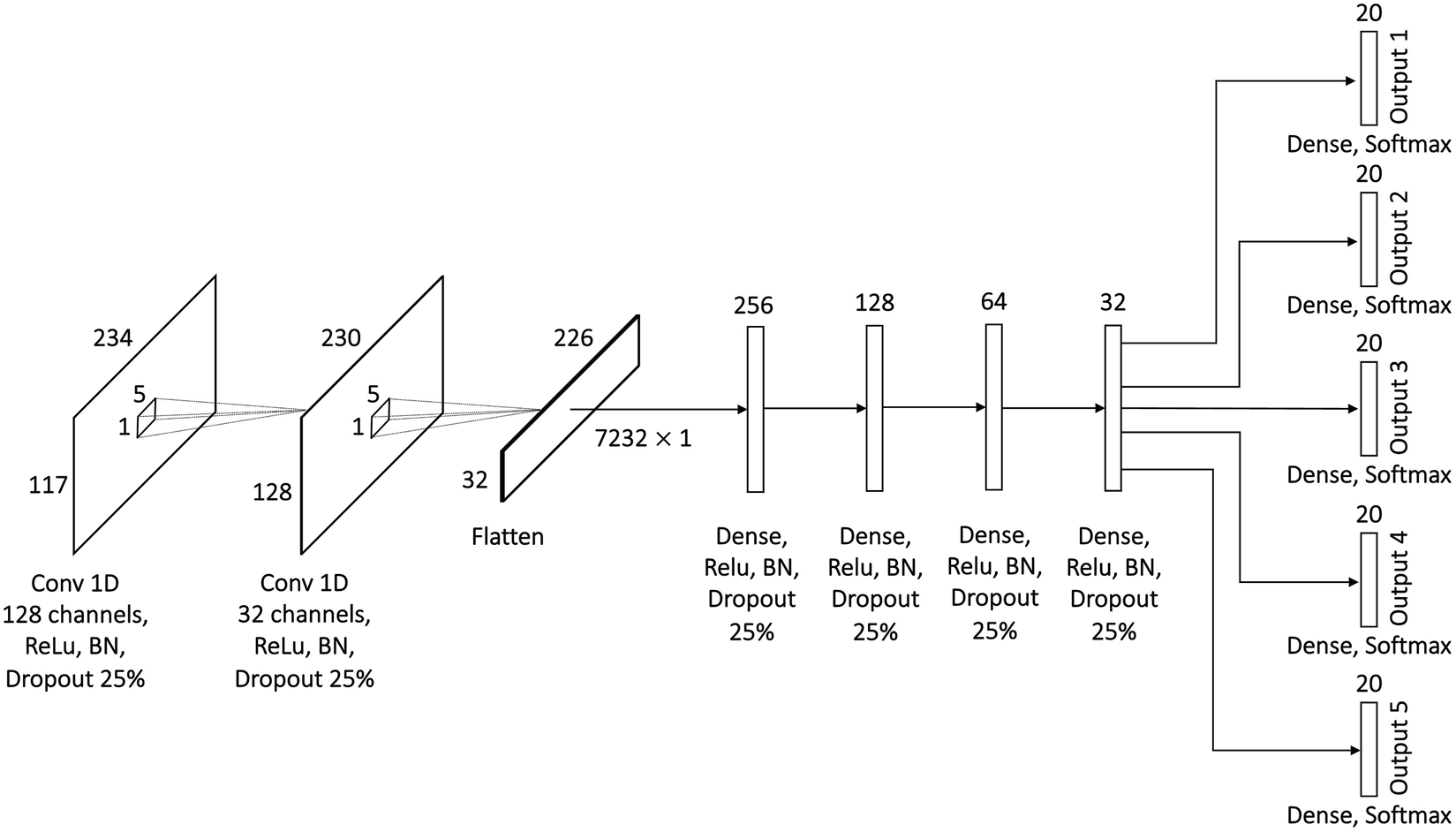 The developed model for multiclass-multilabel classification has architecture similar to the multiclass single-label model. In other words, it also contains two 1D convolution layers for data preprocessing and five fully connected layers for learning (Figure 7). The input to the first convolution layer of 128 channels is a matrix of 117 features and 234 time points. The convolution is performed along the time dimension using 1 × 5 kernel. The resulting 128 × 230 matrix is passed to the input of the second 1D convolution layer with the same 1 × 5 kernel sliding along the time dimension. The output from the second 1D convolution layer is flattened and passed to the dense layers with 256, 128, 64 and 32 neurons. The only difference from the multiclass single-label model’s architecture is that in the multilabel model the output of the penultimate layer with 32 neurons is passed to 5 parallel dense layers with 20 neurons and Softmax activation. Each one of the 5 output layers represents a difficulty level. A single output layer produces a number between 1 and 20 which represents the number of experts who estimated the letter as of a corresponding difficulty level. The outputs from each of these layers later combined to form a label vector of 5 elements. To stabilize the learning process and to prevent overfitting the batch normalization and dropout of 25% were applied after each layer. The Rectified Linear Unit (ReLU) activation used in all layers except the output layers. The model was trained on 5000 epochs with Adaptive Moment Estimation (Adam) optimizer and categorical crossentropy loss. The optimal learning rate of 10–4 was found empirically.