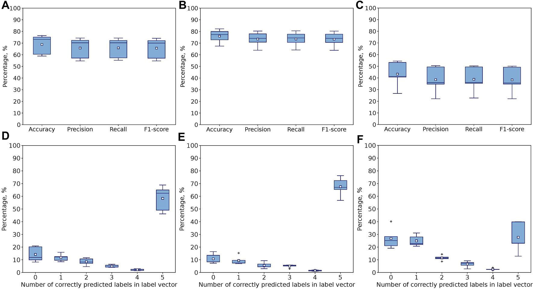 The metrics were averaged over all folds. For example, Figure 8D. Shows the performance of the model across 5 folds with all 117 features by comparing how many label vectors have at least one common element (both value and position are the same), two common elements, and so on. For 5 common elements, depending on the fold, the Exact Match Ratio varies between 77.1% and 89.1%. Notice that 3.1%–6.1% of all samples were predicted incorrectly (none of the elements of predicted and actual label vectors coincide).