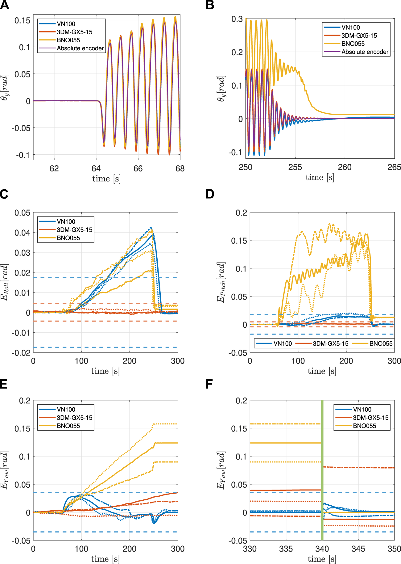 In this experiment, the maximum value of linear acceleration along the z-axis is approximately 4 g and is close to but strictly below the saturation limit of the BNO055 (Table 2). All three IMUs have been tested under the same conditions. Figure 6A clearly shows how the three IMUs signals are all aligned with the encoder at the beginning of the experiment. Figure 6B displays the drift that both the VN100 and the BNO055 have accumulated during the motion, with the latter being higher in magnitude than the former. The 3DM-GX5-15 instead proved to be consistent in the estimation of the Pitch angle throughout the duration of the experiment.