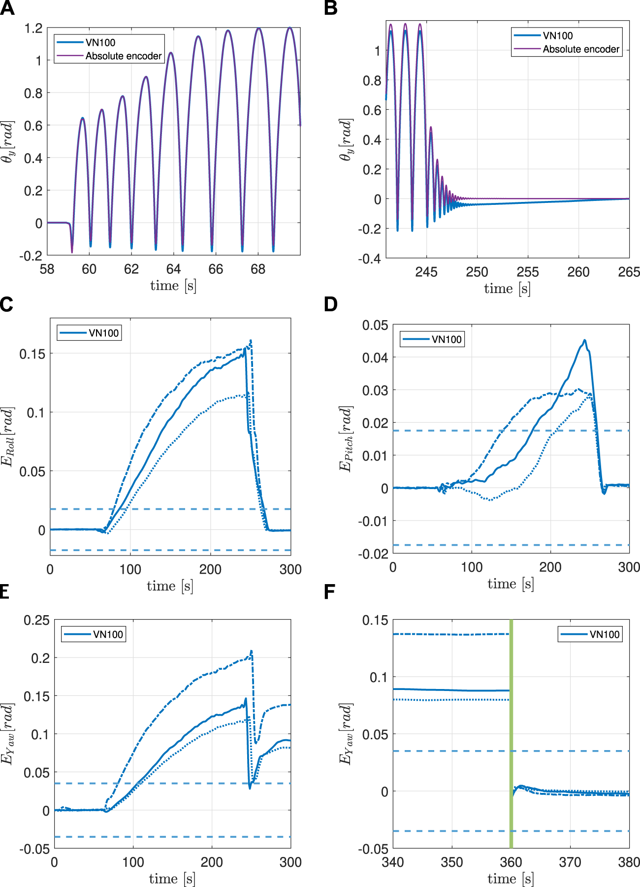 (A)IMU and encoder synchronized pitch measurements at the beginning of the 16 g experiment. (B) IMU and encoder synchronized pitch measurements at the end of the 16 g experiment. (C) Filtered orientation error on x-axis during 16 g experiment. See Figure 5 for lines interpretation. (D) Filtered orientation error on y-axis during 16 g experiment. See Figure 5 for lines interpretation. (E) Filtered orientation error on z-axis during 16 g experiment. See Figure 5 for lines interpretation. (F) Continuation of (E). The green vertical line indicates when the system is temporarily powered off.