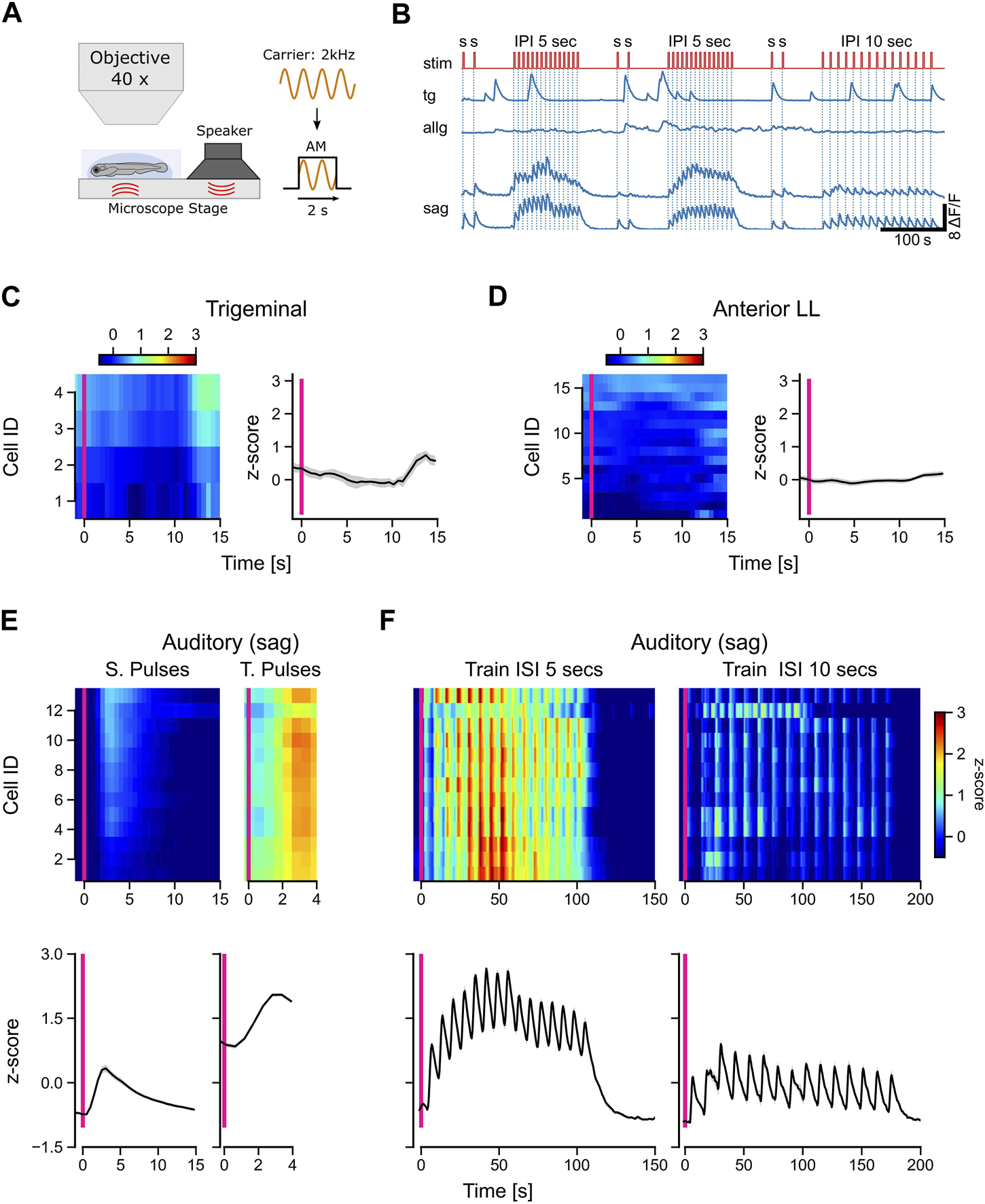Only auditory neurons respond to acoustic stimulation. (A) Schematic representation of the experimental setup and the stimulus used in the experiments. A 2-kHz carrier sine wave was modulated with a step function to turn sound stimulation on and off, thereby generating pulsed tones with a duration of 2 s. (B) Calcium traces (dF/F) of selected trigeminal neurons (TG), anterior lateral line neurons (ALLG), and auditory ganglion neurons (SAG). The stimulus trace is shown in red with single pulses (s) with a duration of 2 s and pulse trains with 15 pulses with a pulse duration of 2 s and an interval of either 5 s or 10 s between the pulses. (C, D) Left in each panel: mean activity (z-score) of individual trigeminal (C) and anterior lateral line (D) neurons to single sound pulses. The y-axis shows the IDs of the individual neurons, which are sorted from top to bottom starting with the highest activity during stimulation (10 s after the stimulus onset). Right in each panel: mean activity (z-score) of all trigeminal (C) and all anterior lateral line (D) neurons (n: 4 and 16, respectively). (E, F) Top in each panel: Mean activity (z-score) of individual auditory ganglion neurons (n = 14) to single pulses [(E), left], train pulses [(E), right], and entire trains with inter-pulse intervals (ISI) of 5 s [(F), left] and 10 s [(F), right]. Bottom in each panel: mean activity (z-score) of all auditory ganglion neurons (SAG). The solid black line in [(C, D), right] and [(E, F), bottom] represents the mean response of all neurons; shaded region represents SEM. The pink vertical bar indicates stimulus onset in all panels. Activity (z-scores) in [(C, D), left] and [(E, F), top] is color-coded, as shown in the scale bars.