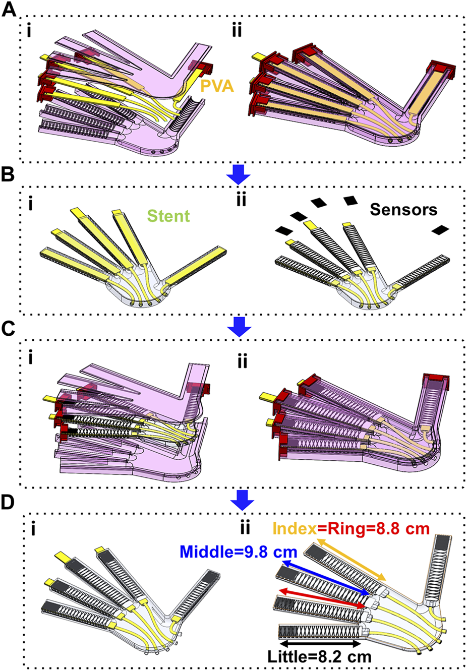 Manufacturing Process: (A) (i) All printed components in CAD assembly, cast made from mold 1, PVA stents, and tubing, (ii) Complete stage 1 cast, shown after filling with Dragon Skin and sealing shut; (B) (i) Result of stage 1 cast, (ii) Cast is equipped with strain-limiting layers and pressure sensor arrays; (C) (i) Fully equipped cast is lain in the stage 2 mold to encase the strain limiting layers and sensors as part of the exoskeleton, (ii) Complete stage 2 cast, shown after filling with Dragon Skin and sealing shut; (D) (i) Result of the stage 2 cast, (ii) PVA stents are dissolved, and stage 3 casting is done to seal the pressure chambers.