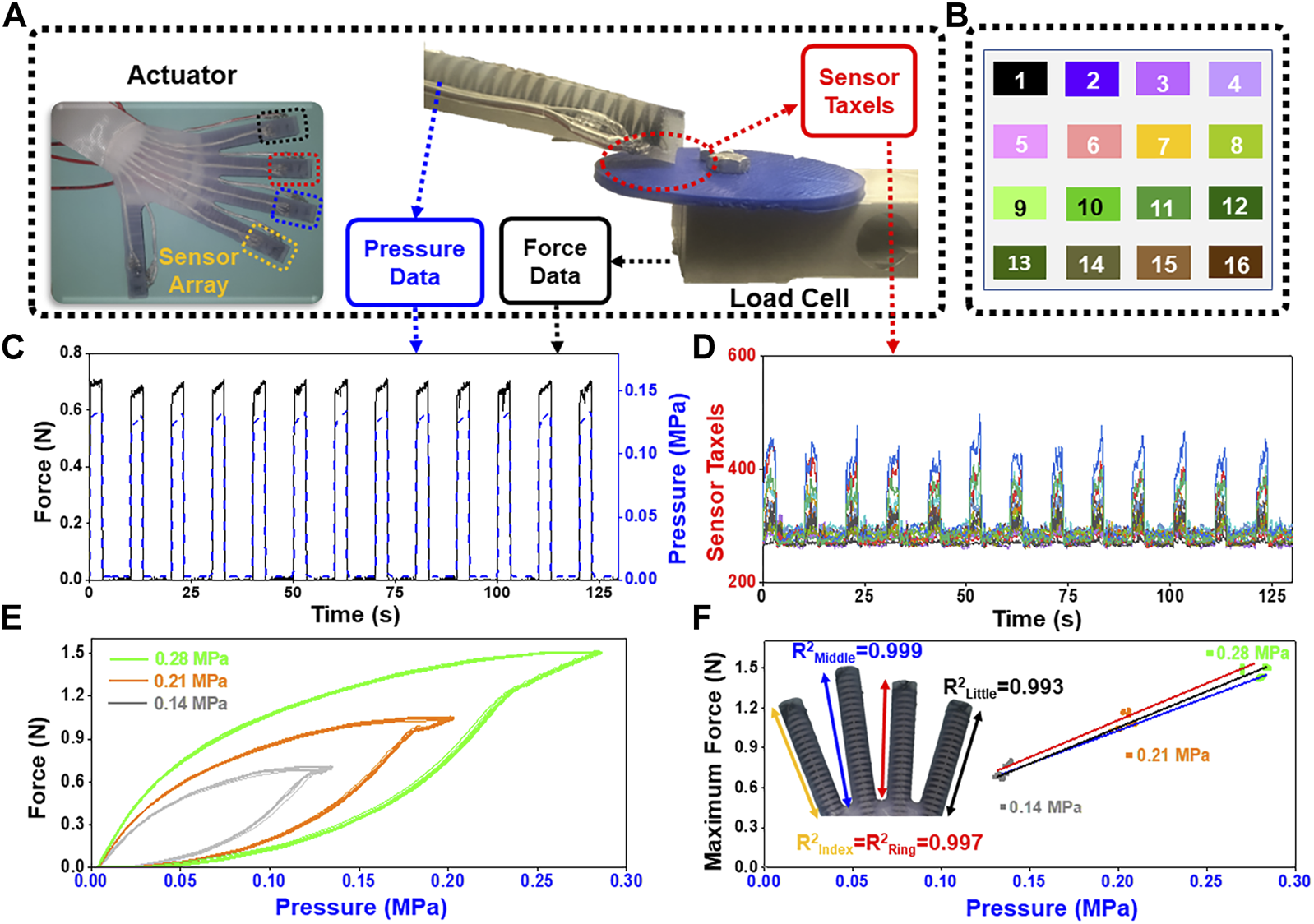 (A) The hand exoskeleton was equipped with an internal pressure sensor and applied forces to the load cell; (B) Color map shows the spatial location of the 16 taxels on the sensor of each finger; (C) Force measured by the load cell for the little finger at an internal pressure of 0.14 MPa; (D) Corresponding taxel signals at the pressure of 0.14 MPa; (E) Force-pressure relationship using 16 actuation cycles of the little finger for three different internal pressures; (F) the maximal generated fingertip forces correlated almost linearly to increasing pressure over the tested range.
