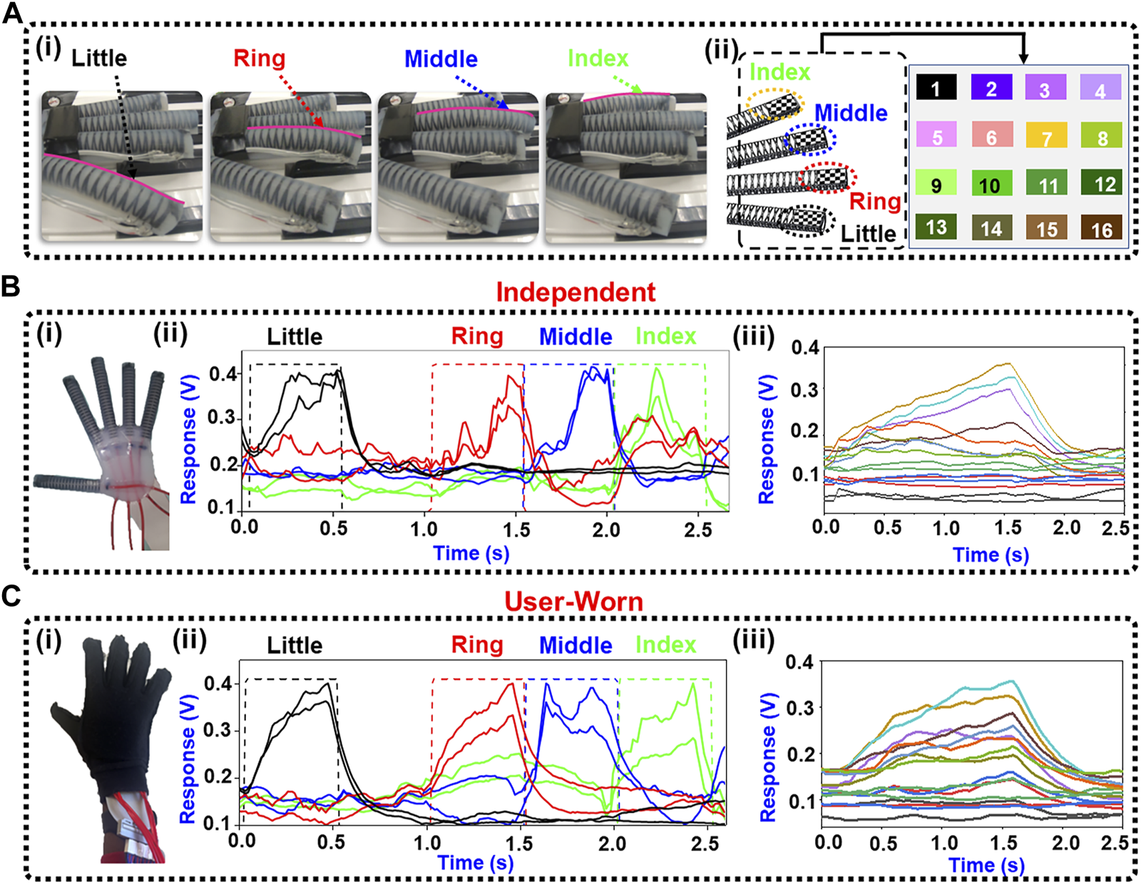 Exoskeleton playing the piano independently and while being worn. (A) (i) Actuation of each finger while playing a song. (ii) Color map of the tactile sensor showing the locations of taxels on each finger; (B) (i) The exoskeleton as used independently, (ii) Two illustrative taxels for each finger are shown while playing the song. (iii) The response of all the taxels for the little finger during a single keystroke; (C) (i) The exoskeleton was inserted into a glove and worn by the human subject. (ii) Two illustrative taxels for each finger. (iii) The response of all the taxels for the little finger from a single keystroke.