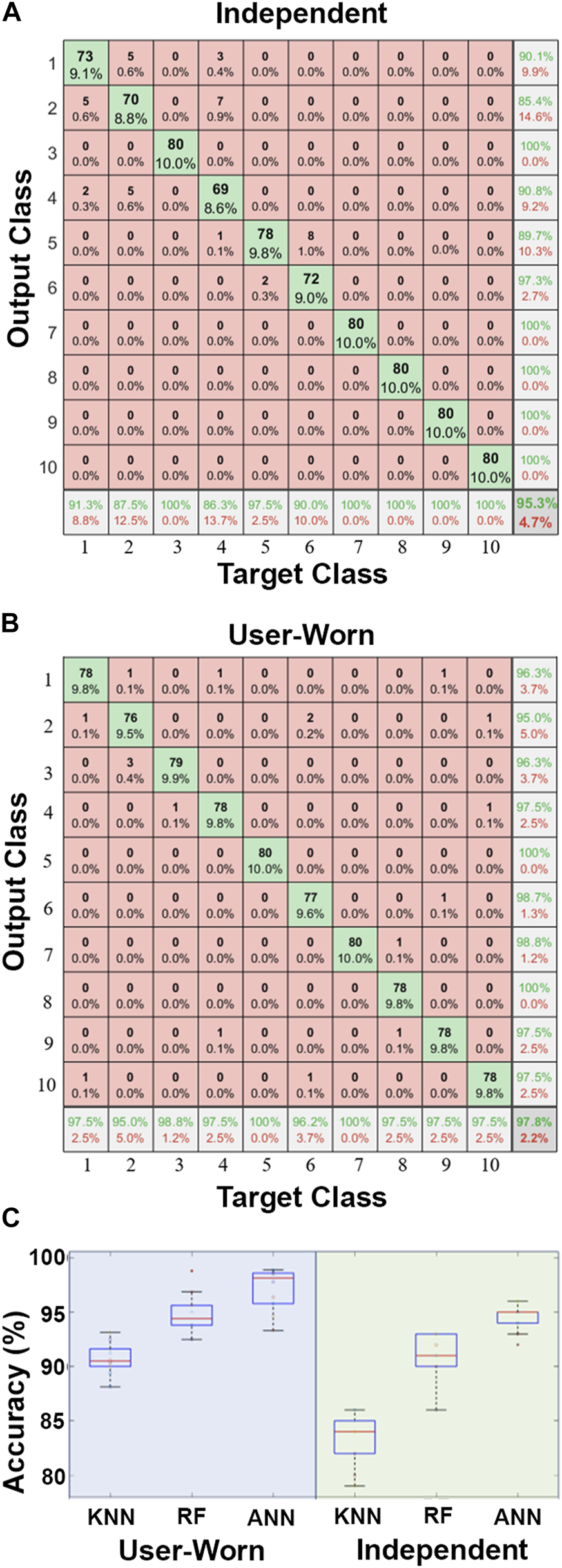 The ANN achieved the highest classification accuracy with 94.60% ± 1.26% for independent use and 97.13% ± 2.00% when worn by a person (Figures 6A, B). The RF had a classification accuracy of 91.00% ± 2.11% for independent use and 94.77% ± 1.96% when worn, while the KNN had the lowest classification accuracy with 83.30% ± 2.45% independently and 90.70% ± 1.48% when worn (Figure 6C). Results from the two-factor ANOVA indicated that the classification algorithms were significantly different from each other (p < 0.01). There was a statistically significant difference in accuracy between independent and worn usage (p < 0.01), and there was also an interaction effect between the two independent variables (p < 0.01).