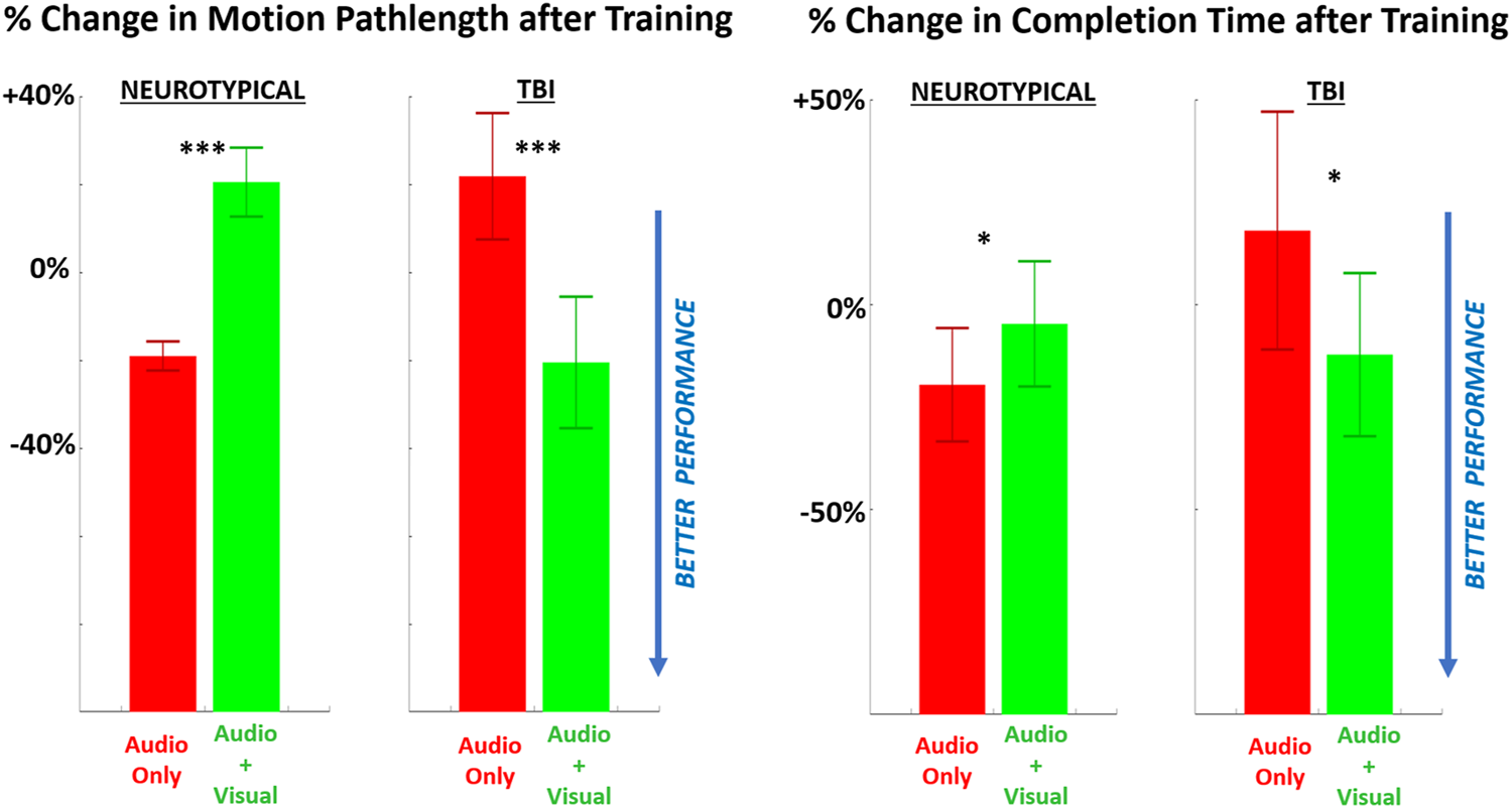 For performance, both metrics showed improvement (i.e., shorter pathlengths, shorter completion time) with multimodal feedback, compared to unimodal feedback (Figure 5), for the TBI group. However, these performance trends were reversed (i.e., performance worsened with multimodal feedback) for neurotypicals. Of further note, the change in motion pathlength was significantly different from zero (baseline) for every pairing of group and training condition. The change in completion time was significantly non-zero only for neurotypicals with unimodal feedback with significantly improved (reduced) completion time compared to baseline.