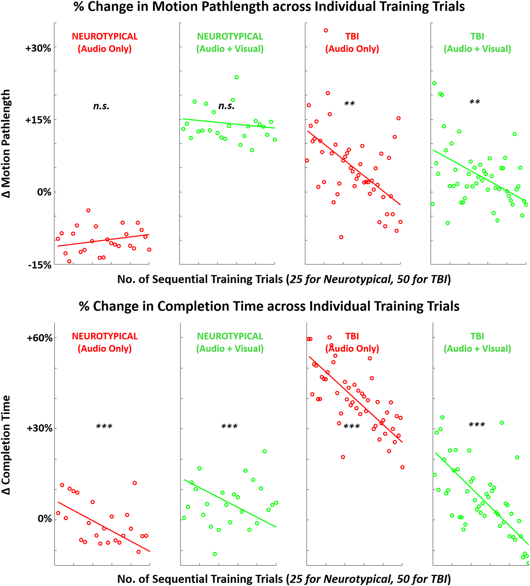 Mean (across participants) in performance metrics (motion pathlength, task completion time) across sequence of training trials with augmented sensory feedback (audio or audio + visual) for each participant group (neurotypical or TBI). Linear regression fitted to indicate global trend within training block in each case pairing feedback condition and participant group. Note: p-values indicate non-zero value for slope coefficient (i.e., significant trend present) of linear regression; *p < 0.05, **p < 0.01, ***p < 0.001.