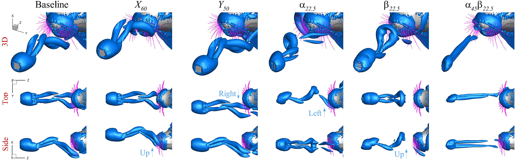 Figure 5 shows the wake structure induced by the plate in the exemplary cases, determined by the criterion, viewed from different viewpoints: 3D, top view, and side view. To aid the comparison, the baseline case is added in the figure. Except for case, the wake displays two distinct vortex rings that alternate between the upper and lower sides (, , and cases) or the left and right sides ( case), with a phase difference of 180°. In the baseline case, where the plate is directly in front of the seal’s nose, the wake interacts with all whiskers. As the plate moves upward in the case and rightward in the case, the wake translates accordingly without changing the pattern. In the case, where the plate tilts to the left, the wake inclines in the same direction. Additionally, due to plate rotation, the vortex ring forming on the left side is stronger than the one on the right side. In the case, where the plate tilts upward, the wake also inclines upward accordingly, and the rotation generates a stronger vortex ring on the upper side than the lower side. In contrast, the case does not exhibit vortex shedding but instead displays two streamwise vortex legs attached to the plate’s sides.