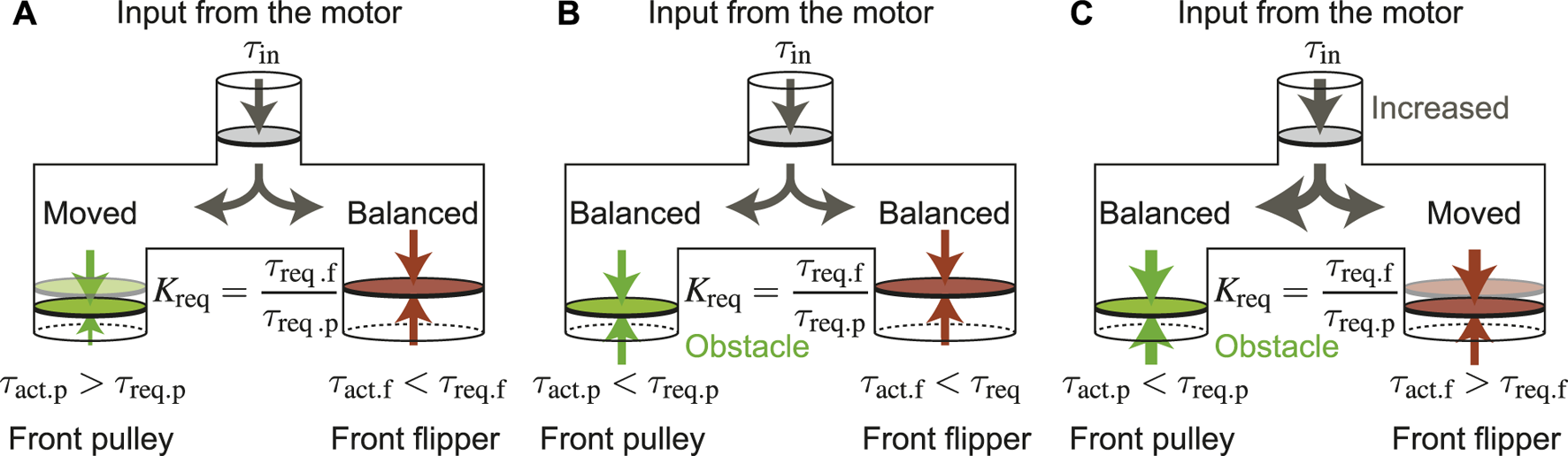 Since the underactuated mechanism divides one input into two outputs simultaneously, the distribution ratio of the two outputs greatly affects the performance. This differential phenomenon is often expressed using a branch tube as shown in Figure 6 (Lan et al., 2007). In normal driving mode, only the drive pulley rotates and the flipper must be stationary. In other words, the actual torque transmitted to the drive pulley τact.p must be larger than τreq.p. In the same manner, the actual torque transmitted to the flipper τact.f must be less than τreq.f. On the other hand, in parallelogram mode, the drive pulley should stop and the flipper must rotate. Therefore, τact.p must be smaller than τreq.p, and τact.f must be greater than τreq.f.