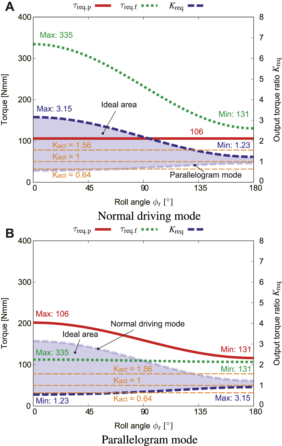 Figure 10A plots how the initial resistance τi influences τreq.p, τreq.f, and output ratio Kreq in the normal driving mode. From Figure 9, the rolling angle at the most severe condition (Kreq range is the narrowest) ϕr = 180° was used. Figure 10B shows how τi influences τreq.p, τreq.f, and output ratio Kreq in the parallelogram mode.