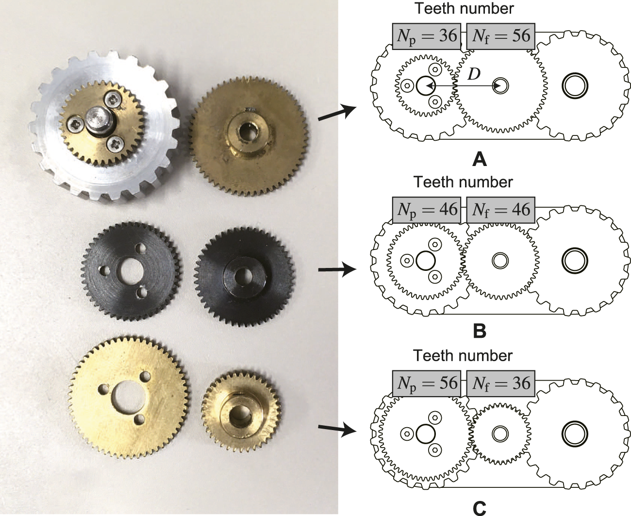 FIGURE 14. Three types of gear ratio: (A) Speed multiplication Kact = 1.56, (B) No speed change Kact = 1, (C) Speed reduction Kact = 0.64.