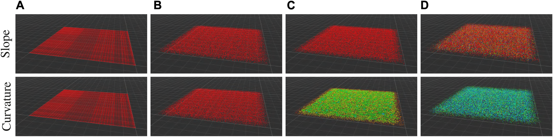A typical pointcloud generated for the noise analysis in Table 1 for each parameter set (A–D). The pointcloud has a side length of 10 m and a horizontal resolution of 5 cm. The point colors represent the cost terms of Eq. 3: the slope cost term on the top row, where red points indicate a cost of 0.0 and blue points indicate a curvature cost of 20.0; and the curvature cost term on the bottom row, where red points indicate a cost of 0.0 and blue points indicate a curvature cost of 0.7.