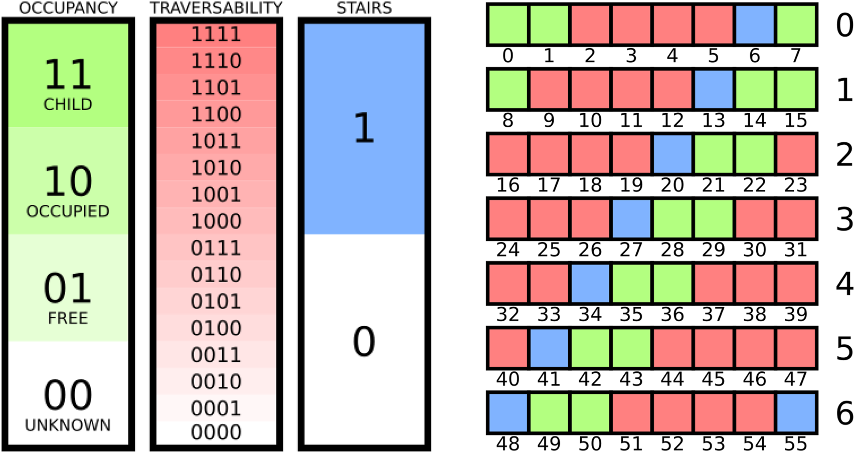 Stair-presence information in the grid map is compressed via a simple binary encoding: