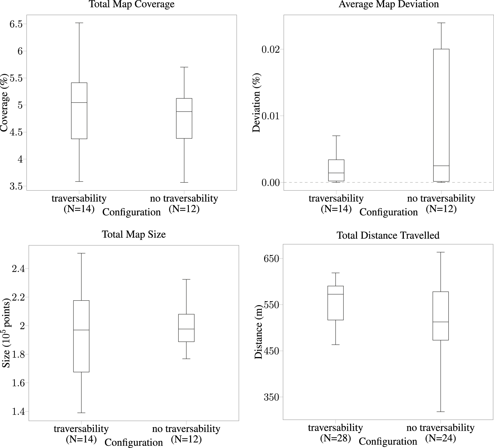 Quantitative simulation results for cooperative exploration performance in the SubT Simulator’s simple_cave_01, a simulated cave environment. We compare exploration performance using the proposed traversability mapping method (“traversability”) to occupancy-only mapping (“no traversability”). Data was collected from twenty-six deployments of a fleet of two Husky robots.
