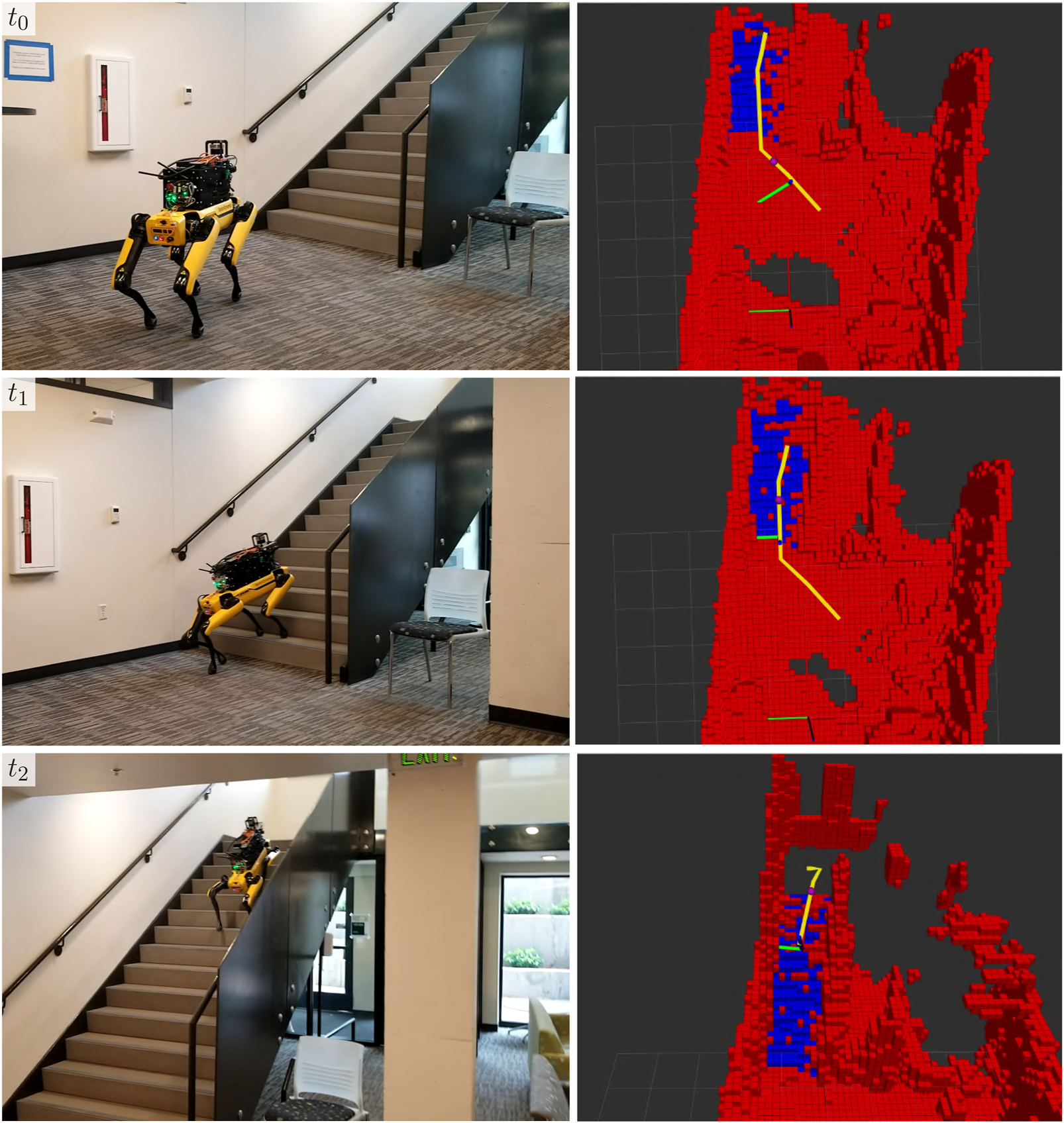 A demonstration of stair-aware planning where a Spot robot traverses a stairway (left) in the Engineering Center at the University of Colorado Boulder in Boulder, CO, United States of America. The corresponding semantic grid map and the pose of the robot with respect to it are shown (right), with stair voxels shown in blue.