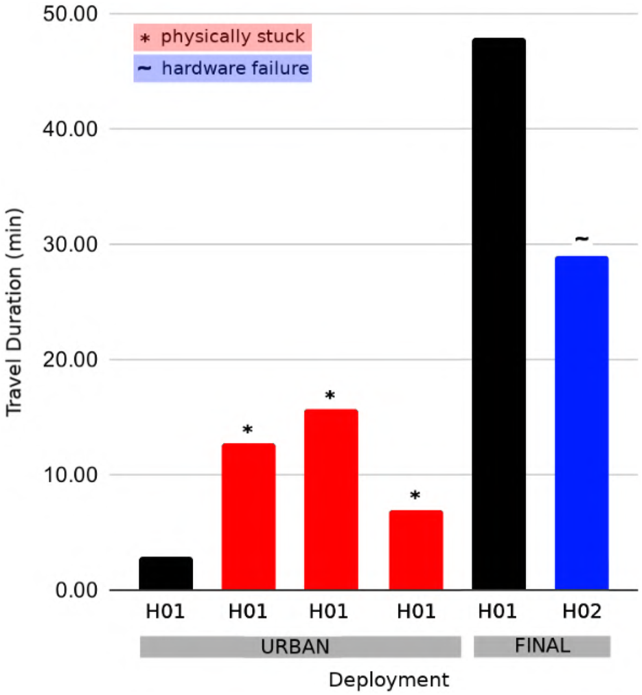 FIGURE 9. Travel duration is illustrated for physical competition deployments of wheeled Husky robots at the SubT Circuit Urban Event and the SubT Final Circuit Event. Deployments that were unable to explore for the total hour due to becoming stuck or experiencing a hardware failure are indicated. Note that the terrain-aware semantic grid mapping method proposed in this work was introduced between the Urban and Final events.