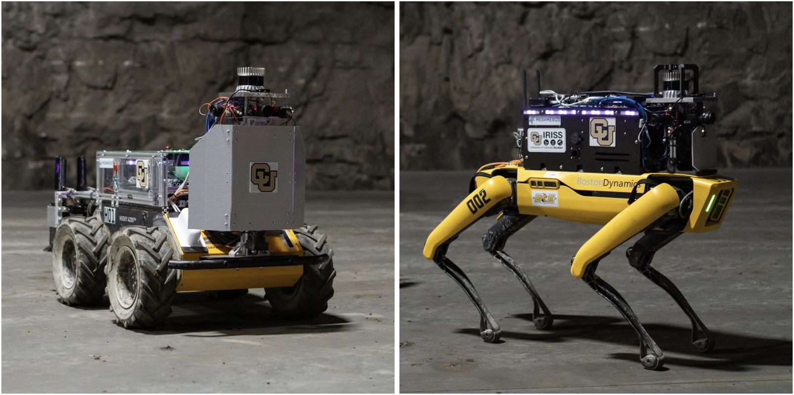 The Clearpath Husky (left) and Boston Dynamics Spot (right) robots used in physical testing and competition in the SubT Final Event.