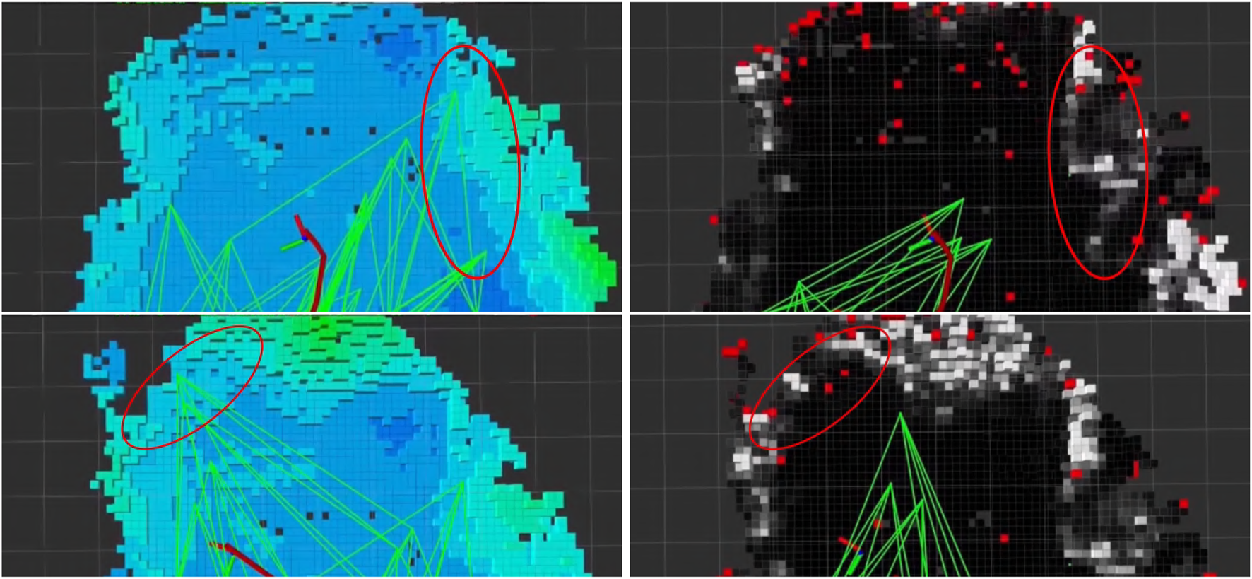 We qualitatively evaluate and illustrate in Figure 6 the effect of the traversability-mapping capability described in Section 2.2 on the propagation of the corresponding planner graph described in Section 2.5. Data was collected by running our terrain-aware navigation stack in two scenarios in the cave_simple_03 virtual world of the SubT Simulator: with traversability-mapping capabilities enabled, and with occupancy-only mapping capabilities. Graph extension is used as a qualitative metric in each scenario to compare planning performance with traversability information to that which only utilizes occupancy information. Several instances are highlighted in which the planner graph incorrectly extended into regions of rough terrain as a result of only utilizing occupancy information, but then avoided extending into such regions when traversability was considered.