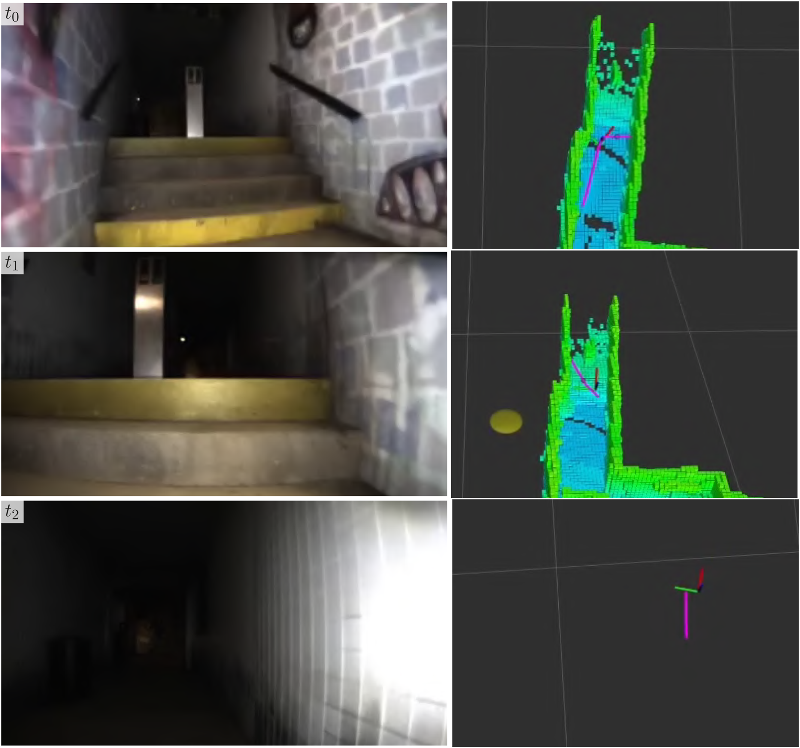 Ahmad and Humbert, 2022) utilizes the mapping method described thus far to quickly and safely explore large, unstructured environments amidst rough terrain and stairs. The planner maintains a graph of nodes over the environment and searches the graph via A* for paths that contribute towards the exploration mission. Exploration tasks are divided into global exploration and local exploration. During global exploration, preferred paths include those with high volumetric gain in the grid map. Local exploration prioritizes sampling the immediate environment for new candidate graph nodes which are evaluated for connectivity to the main graph using candidate edges. The candidate edge is discretized into a series of candidate poses, and points spanning the vehicle footprint at each candidate pose are projected in the direction of gravity. Incident voxels are considered the “ground” and are tested for traversability and stair validity. A pose is: