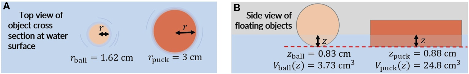 (A) Top view of the floating objects’ cross section with the calculated radius at the water surface. (B) Side view of the floating objects with the submerged distance and volume indicated.
