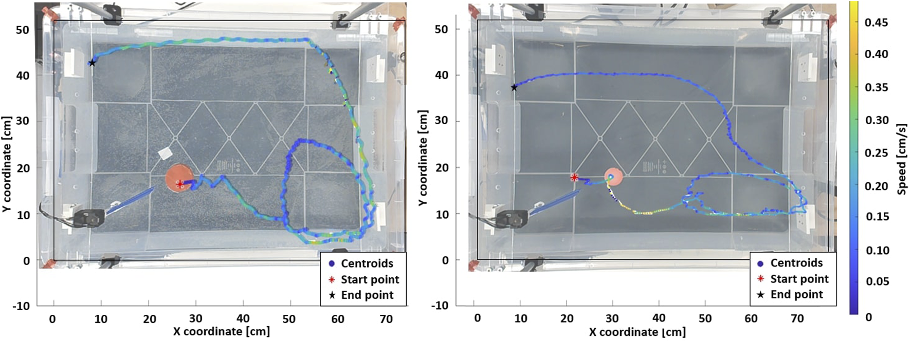 Figure 7 shows the trajectories of the floating objects, where the water is actuated by two fins. Each sequence with fixed parameters was performed 5 times and the objects were released from starting in the middle of the tank. As depicted in subplots 1–2, the trajectories are highly similar when using standard amplitude and pause time. The object departs from the unstable middle position of the storage box, bouncing on wavelets as the trajectory is tangent to the waves generated by the fin strokes. Both objects then follow the clockwise current towards the top left motor, experiencing re-acceleration at the top left fin within the 45 s of the experiment. This process can be highly repetitious.