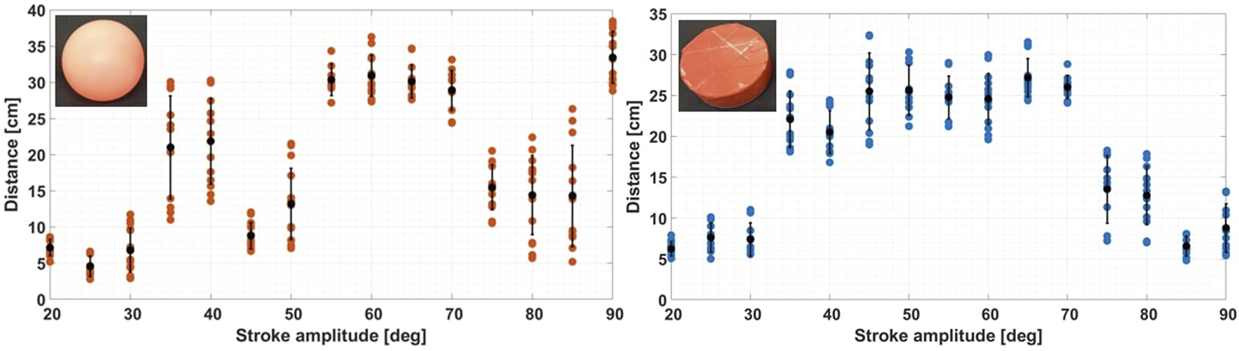 Energy is a crucial parameter in characterizing this system, and in order to quantify it, object displacement is recorded when a fin is actuated with a single back-and-forth stroke. Each test is performed 15 times with clear outliers (due to tracking errors) removed. Figure 4 shows the relationship between the amplitude of the fin stroke and the distance traveled by floating items. Black points and error bars represent the mean value and standard deviation for each stroke amplitude.
