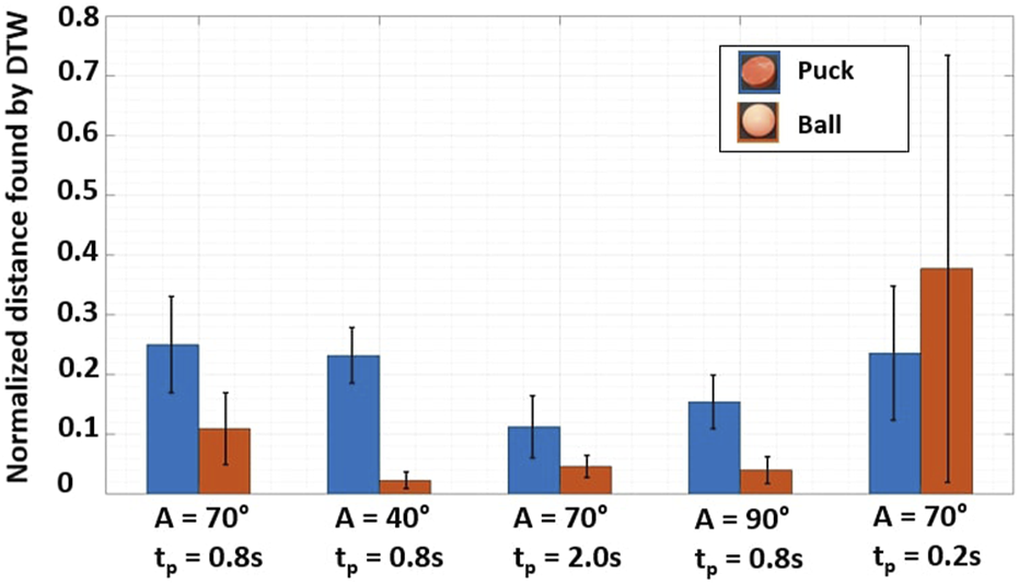 Normalized distance found by Dynamical Time Warping, between the trajectories for limit cycles with a single motor (Figure 5) and a representative trajectory. Blue bars are related to the Puck, while orange bars are related to the Ball. Excluding the final results A = 70° and tp = 0.2 s, the normalized energy is consistently lower for the ball as compared to the puck. DTW is therefore a valid way to sort objects based on their energy.