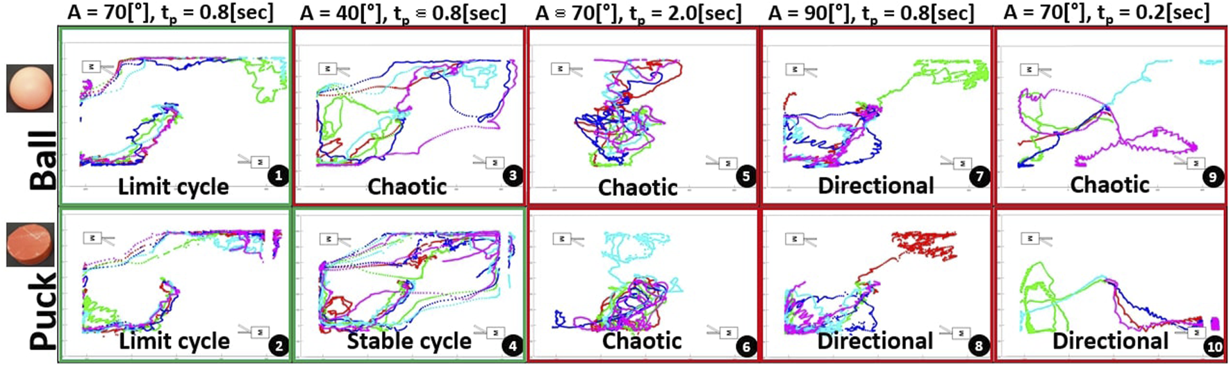 A smaller amplitude (subplot 4) results in distinct emergent limit cycles for the puck only (this behavior was experimentally verified over 10 loops). The ball exhibits similar behavior, but the pattern is inconsistent due to the additional wavelets created by the second motor while the ball is in the middle position. With maximal amplitude (subplots 7–8) or a small pause time (subplots 9–10), the floating objects receive an excess of energy and wavelets from the two motors, leading them to a dead end in one of the corners opposite a motor rather than a limit cycle path. Finally, with a pause time of 2 s, both objects react chaotically to the free time between impulses within the system, as shown in subplots 5 and 6.