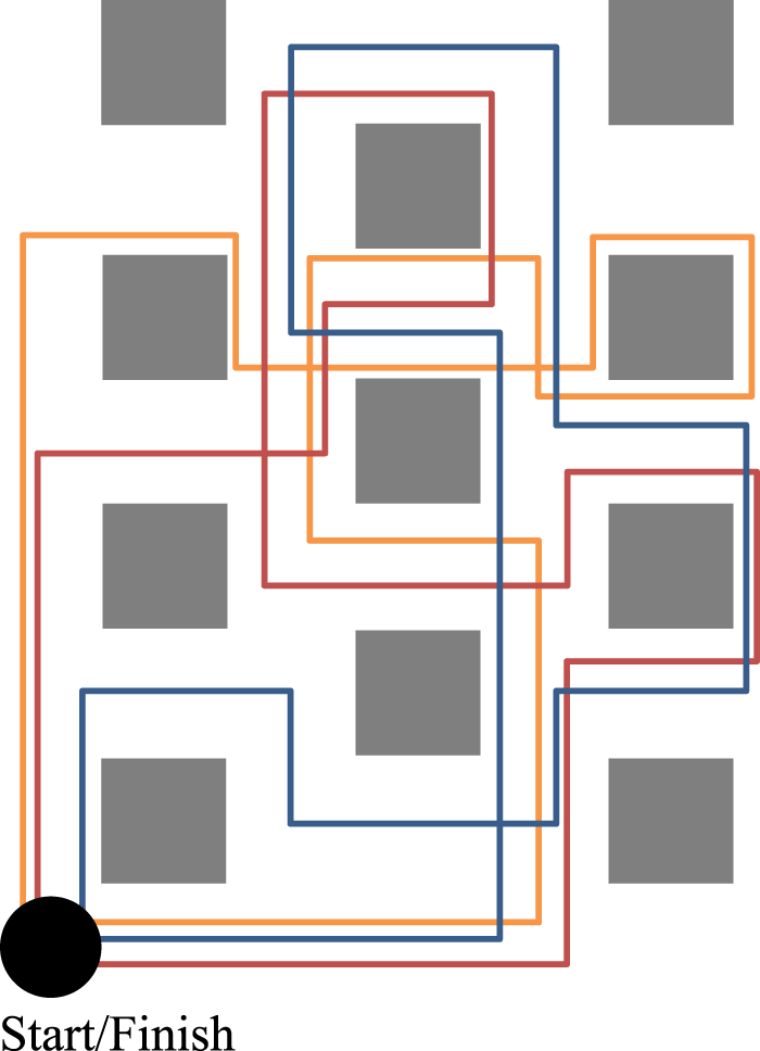 The room and obstacle layout used in the study design, with the three paths through it. Experimental conditions were balanced across courses to mitigate effects due to differences in the course design.