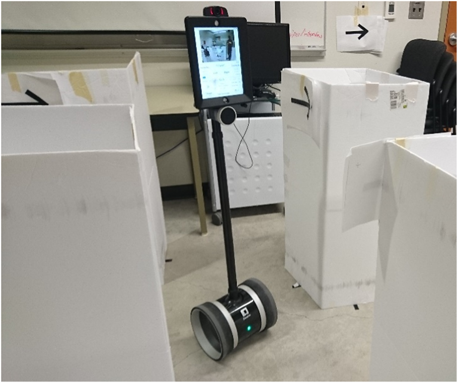 Participants operated a Double 2 robot (Double Robotics) with a 150° field-of-view camera. The robot’s camera feed (640 × 480 pixels) was viewed full-screen (with black bars on the wide-screen sides) on 24-inch monitor, in a separate space from the robot, and participants were seated at roughly the same position with respect to the monitor. The system maintained at least 15 frames per second, but was as fast as 30 frames per second, depending on network health.