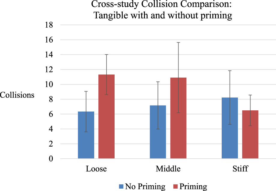 For the tangible priming study, we recruited 25 participants; however, one did not complete the experiment due to technical issues. Two other participants were identified as outliers: we observed them not attempting to avoid obstacles (e.g., laughing and pushing obstacles around seemingly on purpose), and this was reinforced from their data (>1.5 Inter-quartile range). This resulted in 22 participants (mean age of 24, standard deviation of 6.3 years; 12 female).