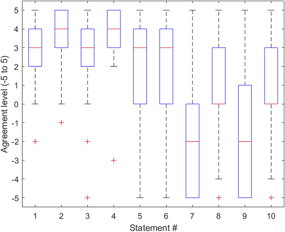 Boxplot representing the distribution of data gathered for each statement in the survey provided in Table 1. The lower half of each box represents the first quartile of the data, the middle of the box represents the second quartile of the data, and the top half of each box represents the third quartile of the data. The whiskers of the boxplot represent the minimum and maximum data points and their variability in comparison to the interquartile range. Outliers are shown. This boxplot was created using MATLAB software.
